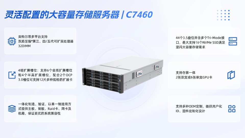 當海量數據爆發式增長成為常態,數據存儲與處理需求呈指數式激增。云尖信息C7460大容量存儲服務器憑借Intel的ICX/EGS和瀾起的津逮雙路平臺,靈活適配DDR4 PCIe4.0或DDR5 PCIe5.0,搭配2個固定OCP與最多10個PCle插槽,性能強勁。4U 機框44個3.5盤位結合多個Anybay(Tri-Mode,同時支持SAS/SATA/NVme)槽位,輕松應對多介質存儲,無論是互聯網數據管理,還是智算中心核心存儲,都能提供高效可靠的解決方案。