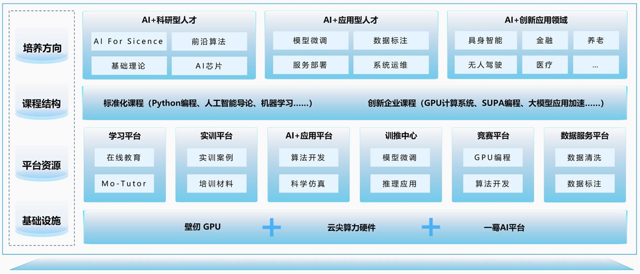 云尖信息聯(lián)合壁仞科技、智海Mo打造“課程+算力+平臺”軟硬協(xié)同的高校 AI 教科研一體化解決方案,賦能我國高校AI+科研型、AI+應(yīng)用型、AI+創(chuàng)新型人才培養(yǎng)模式改革創(chuàng)新。