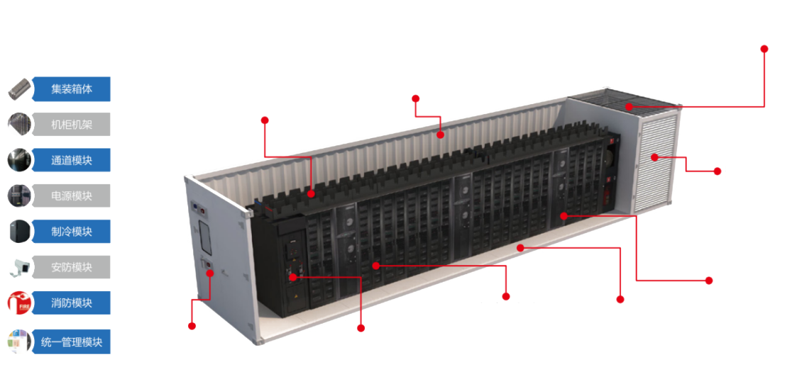 CR7000集裝箱數據中心解決方案集供配電系統、制冷系統、管理系統、消防系統、綜合布線、服務器機柜等于一體,具有安全可靠、快速部署、靈活擴容、高密高效、智能管理等特點。