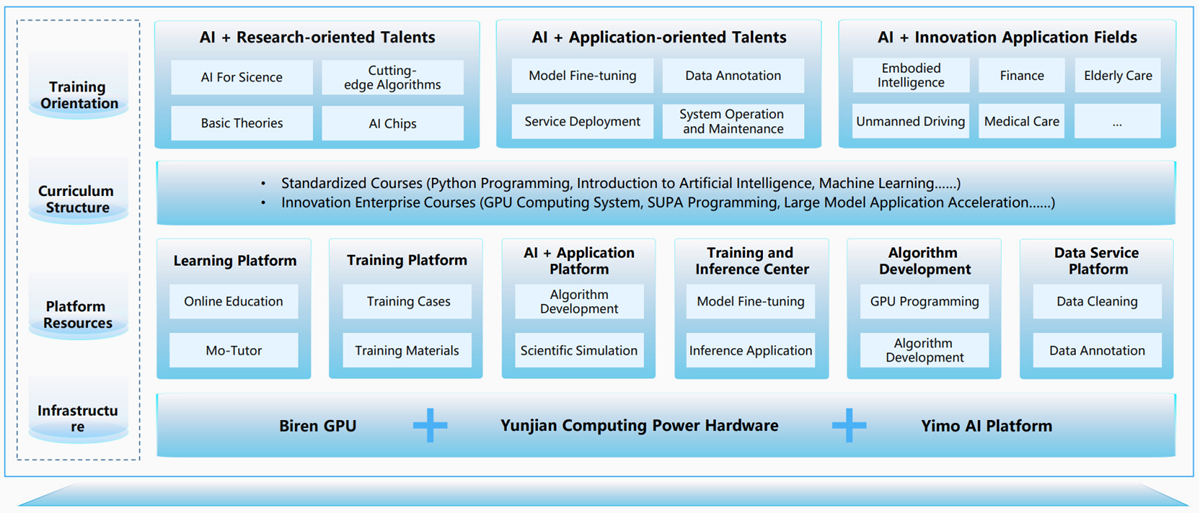 Yunjian Information, in collaboration with Birentech and Zhihai Mo, has developed an integrated AI teaching, research and application solution for universities. This solution features hardware-software collaboration based on the "Curriculum + Computing Power + Platform" model, empowering the reform and innovation of AI + research-oriented, AI + application-oriented, and AI + innovation-oriented talent cultivation models in colleges and universities in China.