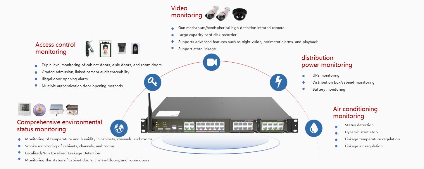 The microring system is mainly composed of intelligent monitoring host, sensor/controller, local control panel and external linkage device (interface), and works with the operation management system software. Implements environmental monitoring (smoke sensing, temperature and humidity, water immersion, video, access control), power monitoring (PDC, UPS, battery, air conditioning), management monitoring (asset management, capacity management, energy efficiency management, 3D visualization) and other functions.