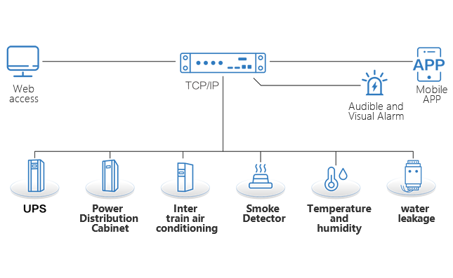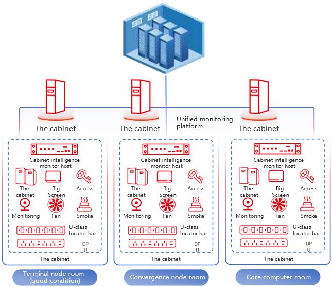System architectureThe dynamic ring system is mainly composed of intelligent monitoring host, sensor/controller, local control panel, external linkage device (interface) and other components, and works with the operation management system software to realize environmental monitoring (smoke sensor, temperature and humidity, water leakage, video, access control), power monitoring (power distribution cabinet, UPS, battery, air conditioning). Management monitoring (asset management, capacity management, energy efficiency management, 3D visualization) and other functions.